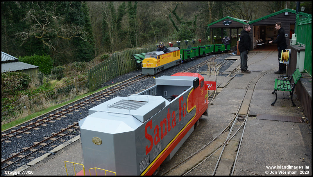 'Sante Fe' stands in the yard as 'Union Pacific' heads out on a staff or test train from the Crogga Heights station.