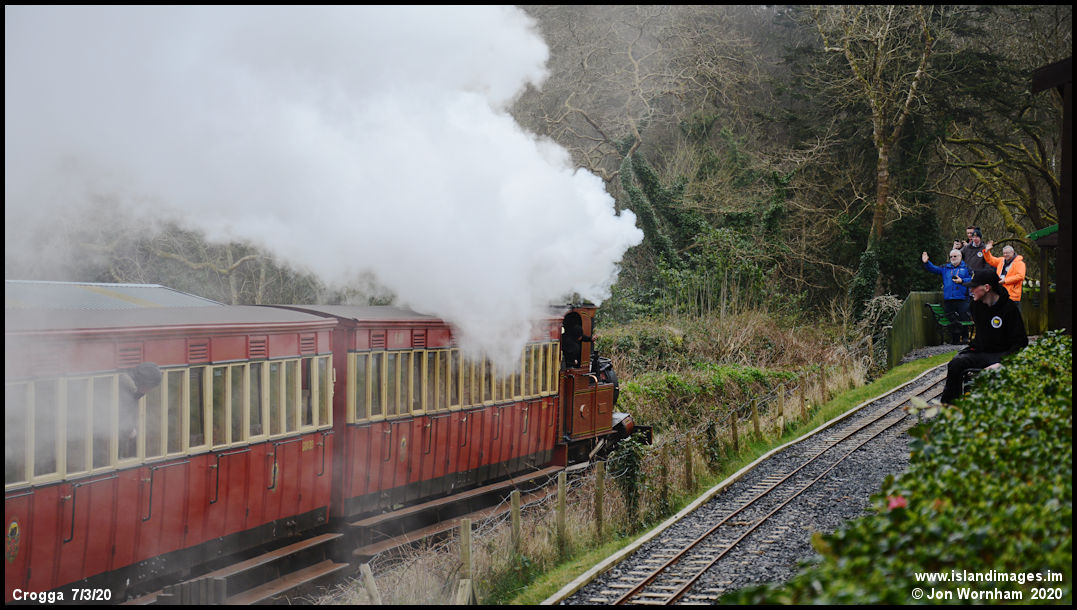 The Isle of Man Railway train passing some of the Crogga Valley operating crew.