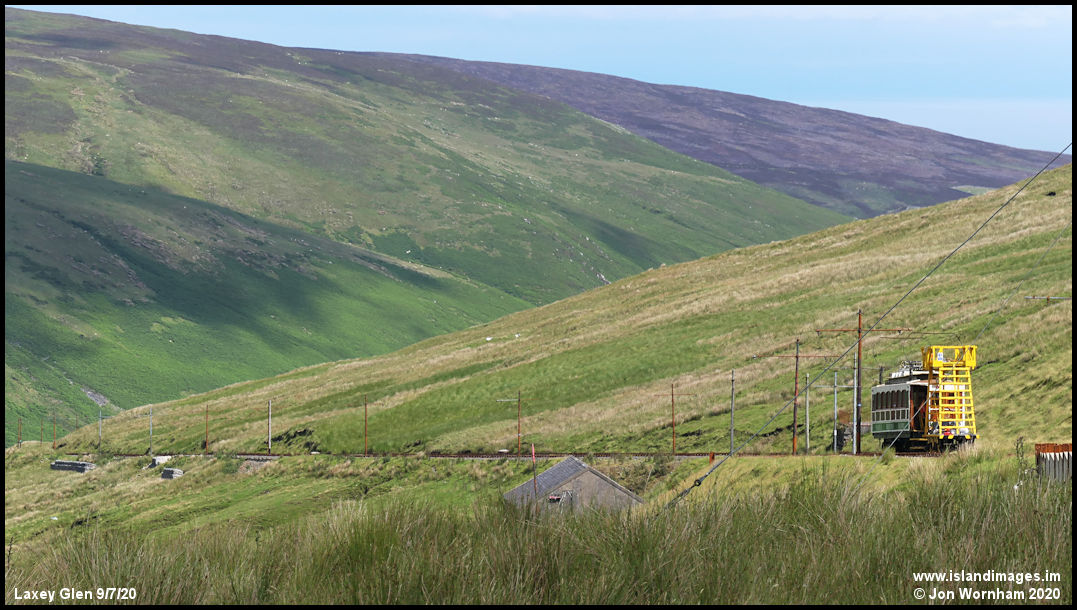 Car No 4 heads down into Laxey Glen, passing the old power generating station.