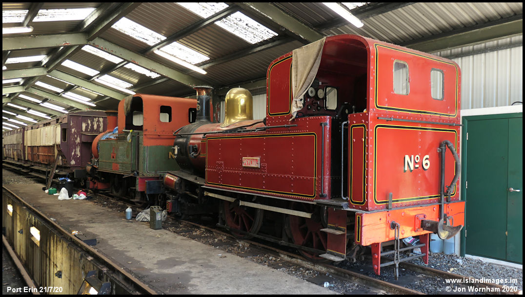 Out of service locos No 6 'Peveril' and No 5 'Mona' in temporary storage at Port Erine carrige shed along with some coaches also awaiting restoration.