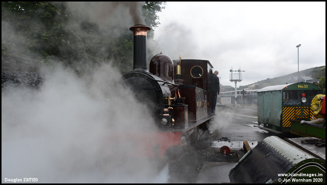 Manx Northern Railway No 4 'Caledonia' comes off shed. It's still a bit damp after a very wet morning but the weather is improving!