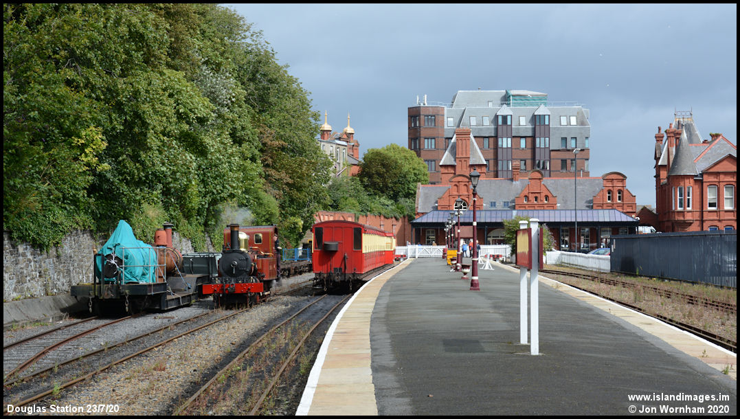 An overall view of Douglas Station as 'Fenella' runs round her train. There used to be two double sided platforms at the station when trains also ran to Peel and Ramsey from here.