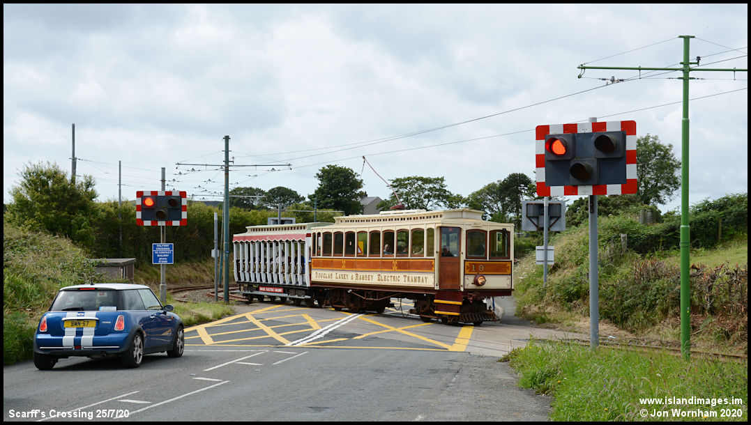 Car No 19 crossing the maon Onchan to Laxey Road at Scarffe's Crossing.
