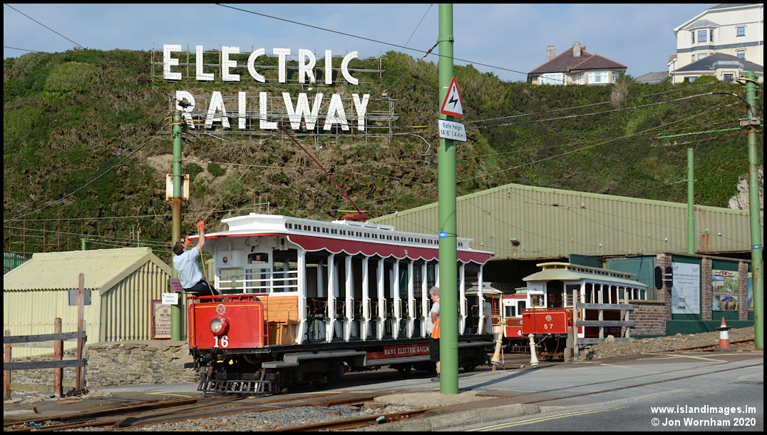The conductor has to be nifty here with the trolley pole as No 16 is returned to the Derby Castle depot at the end of the day.