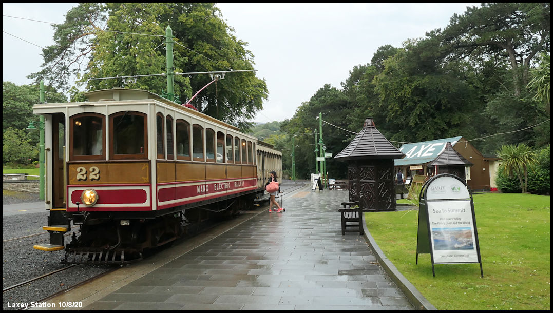 Passengers disembark from No 22 at a rather damp Laxey station.