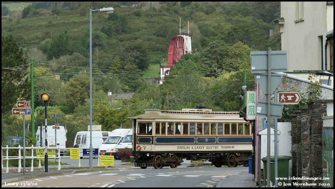 Headin south to Laxey and catching up with Car No 7 again as it crosses Mines Road with the Laxey Wheel as a backdrop.