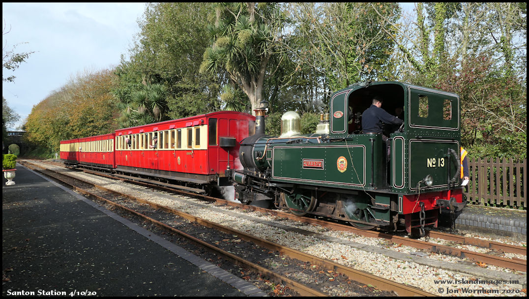 IMR No 13 'Kissack' stands at Santon Station with a Douglas bound train awaiting the arrival of the opposite direction Dining Car Train.