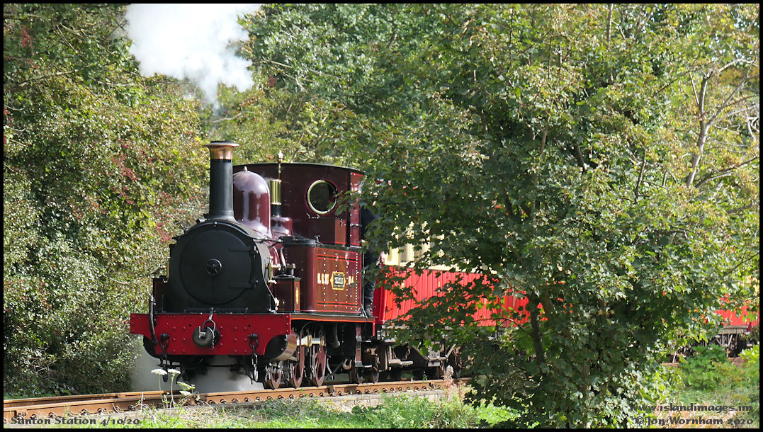 Manx Northern Railway No 4 'Caledonia' comes into sight with the Dining Car Train.
