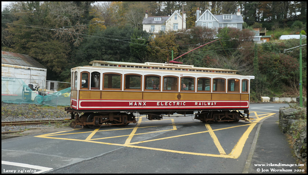 Car No 22 on the northernmost of the three road crossings before entering the station at Laxey, with the one time Laxey Bus Garage just getting into shot.