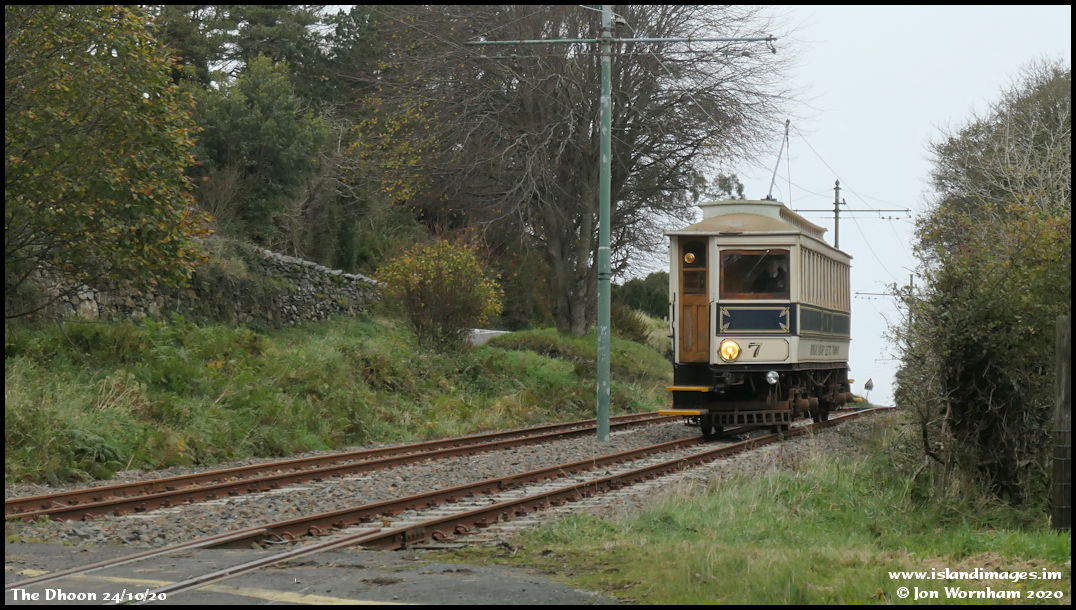 Car No 7 approaching The Dhoon with a southbound service. There's another esteemed author on board this tram, it's Andrew Scarfe and he's driving it!