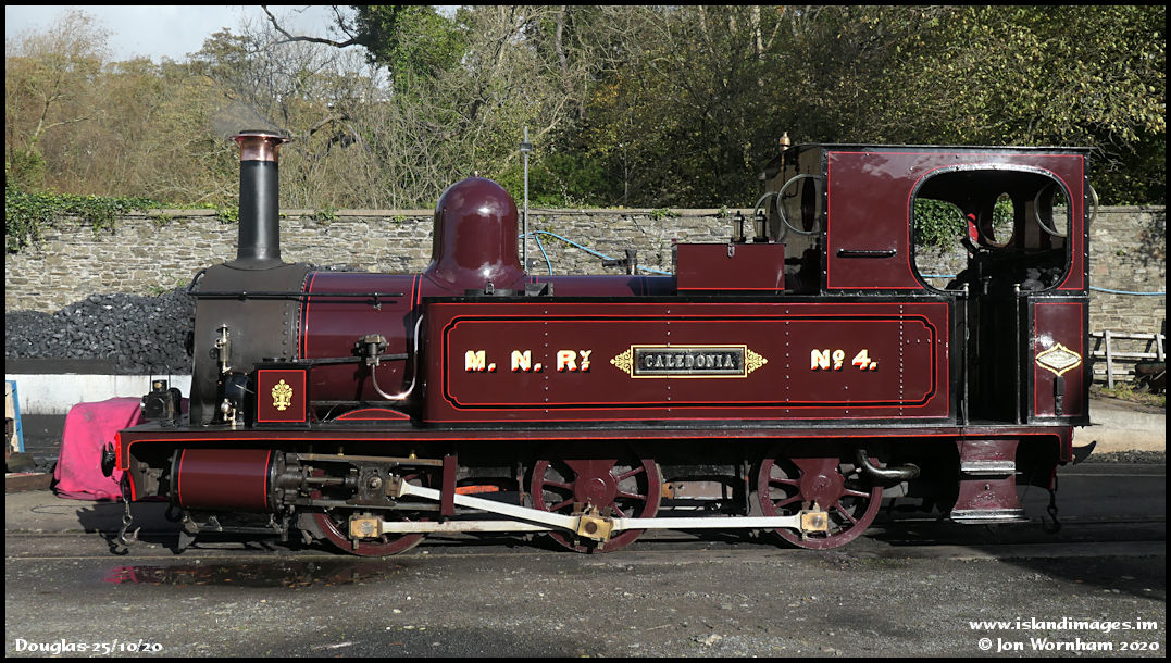 Manx Northern Railway No 4 'Caledonia' gleaming in the sunshine at Douglas before hauling the Sunday Dining Car Train service to Castletown.