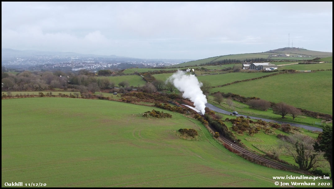 The train pictured in the narrow Oakhill cutting on the climb up to Keristal. The town of Douglas can be seen in the distance.
