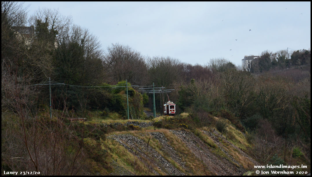 Illuminated Car No 9 appears on the descent down from Minorca into Laxey, returning from a trip to Dhoon Glen.