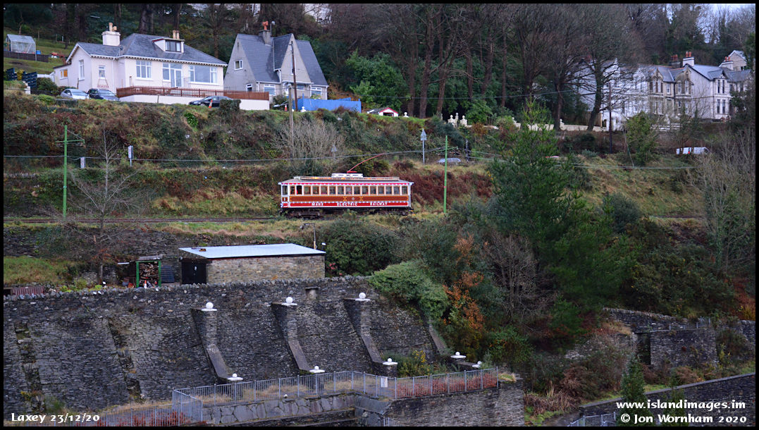 Car No 9 passing above the old mines washing floors and the Great Laxey Mine Railway's carriage shed and workshops.
