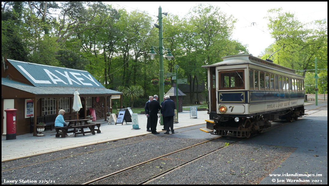 Car No 7 after arriving at Laxey, with railway staff members in a dicussion!