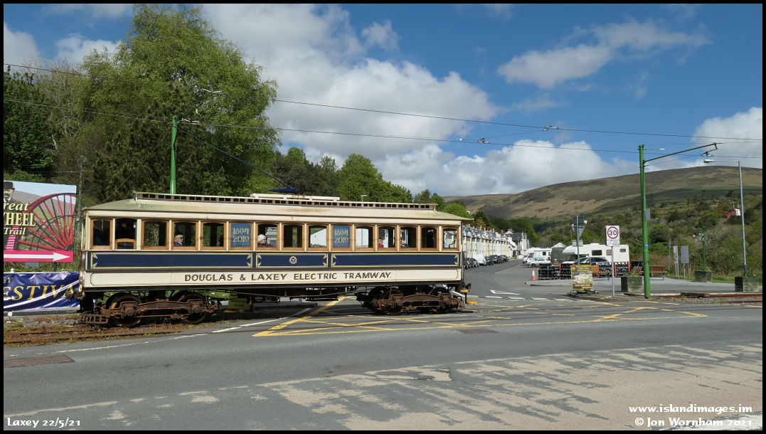 Car No 7 crossing 'Ham and Egg Terrace', leaving Laxey for Ramsey. The Laxey Wheel has just managed to make it into the picture on the right.