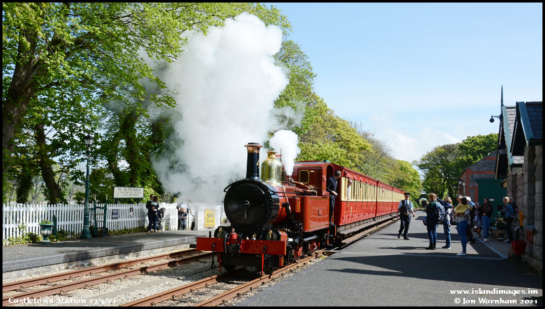 After passengers have left and joined the train, 'Loch' sets off for Colby and Port Erin as the tail of the Douglas bound train disappears under the bridge in the background.