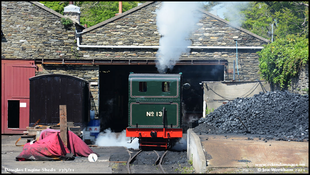 'Kissack' about to enter the engine shed to top up the water tanks, before emerging again to take more coal. There is a 45 minute turn-round time before the next departure back to Port Erin.