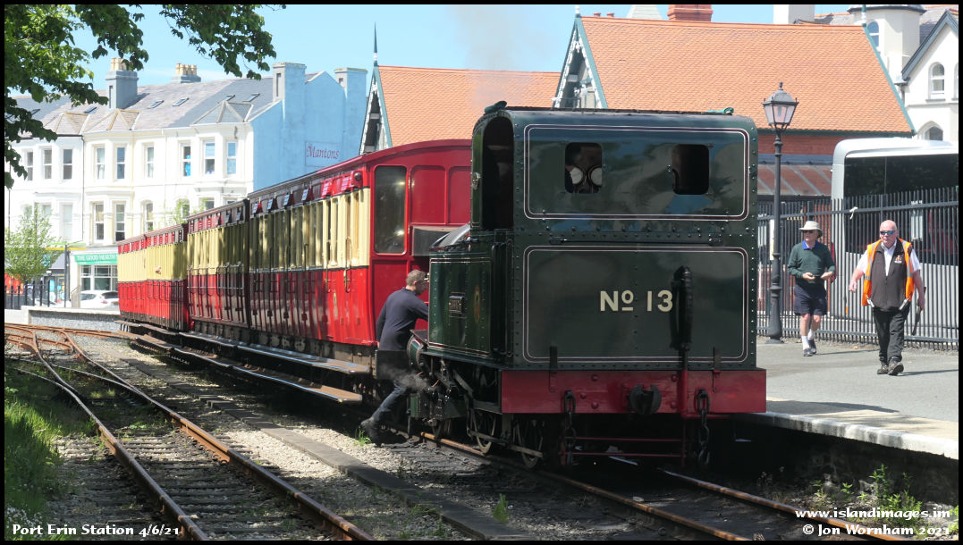 'Kissack' coulpes up to the train as the Port Erin stationmaster brings the single line staff out to the engine crew.
