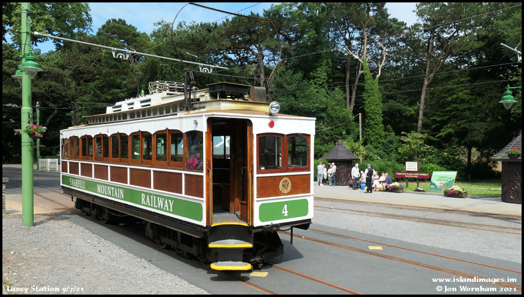 At Laxey, Snaefell Mountain Railway Car No 4 awaits departure for the summit.