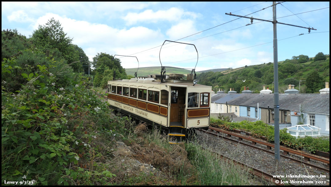 Repainted in a new colour scheme this season, SMR Car No 5 descendes slowly towards the station, passing the depot and behind 'Ham and Egg Terrace'.