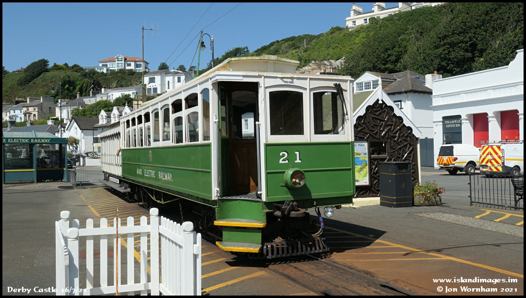 Green liveried Car No 21 waits at Derby Castlt before operating the 11:40 to Ramsey. On a hot day the trailer is more popular with passengers than the power car!