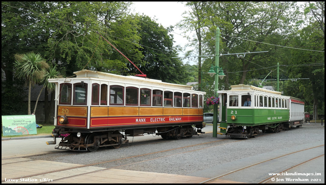 As Car No 20 stands in the station, green 'Nationalisation' liveried No 21 arrives from Douglas