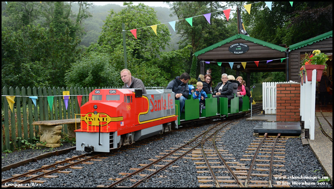 The second train of the day departs behing 'SF'. This loco is not as powerful as 'UP' and can have problems climbing the bank from the lake in wet conditions, but the hope is to run an intensive two train operation.