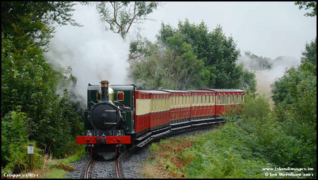 The next main line train of the day rounds the curve from Port Soderick. Locomotives have been swapped at Douglas and now No 13 'Kissack' is in charge.