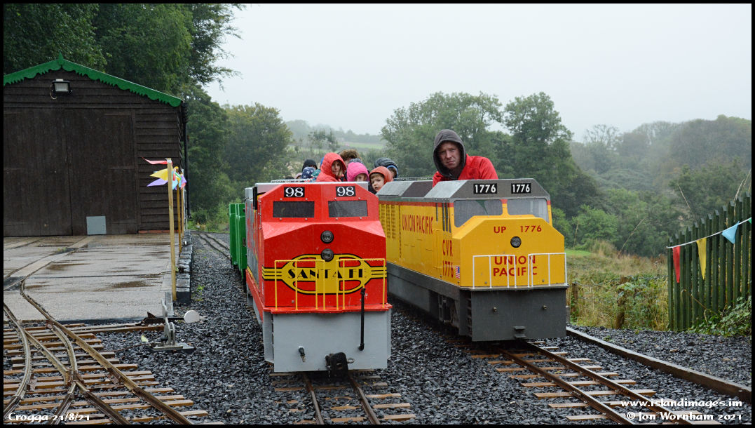 'UP' arriving back at Crogga Heights with 'SF' stabled on the other running line. The wet weather hasn't deterred the passingers though and the station area is under cover with refreshments available including fresh baked hand made pizza!