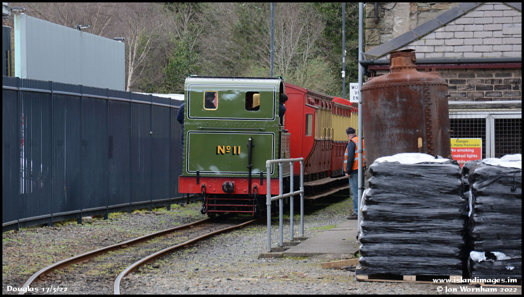 Back at Douglas and 'Maitland' pauses on the main line outside the workshops before propelling the carriages back into their shed.