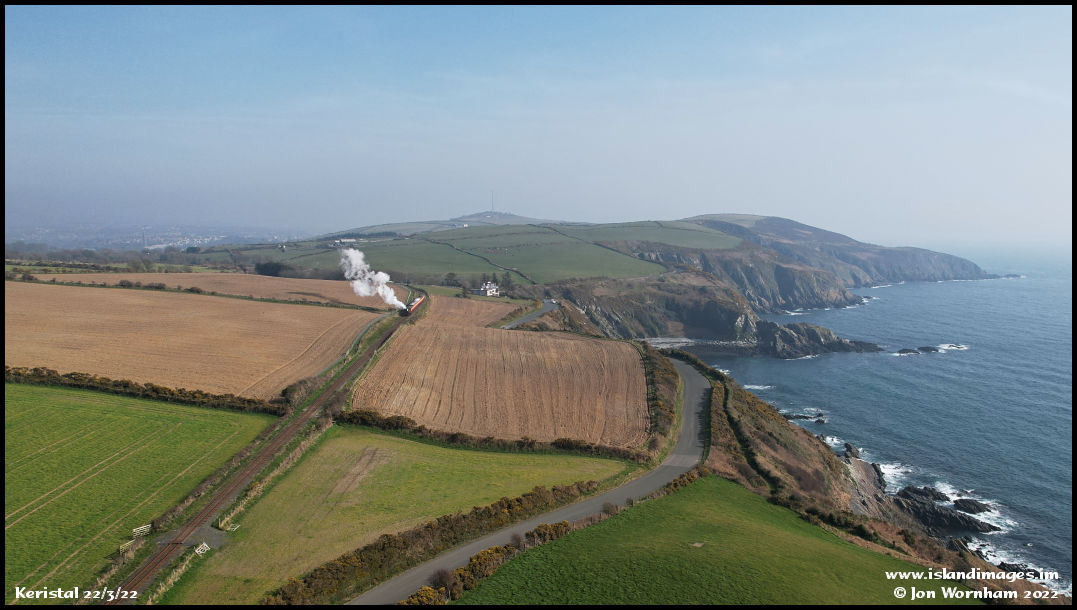 I was actually taking some aerial shots of Port Soderick for another project when I heard the train approaching, climbing the bank past Keristal.
