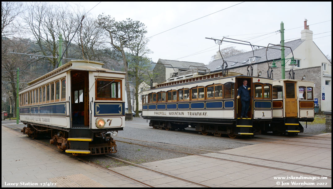 The blue team! MER Car No 7 is about to head back to Derby Castle and Snaefell Car No 1 will head for the summit.