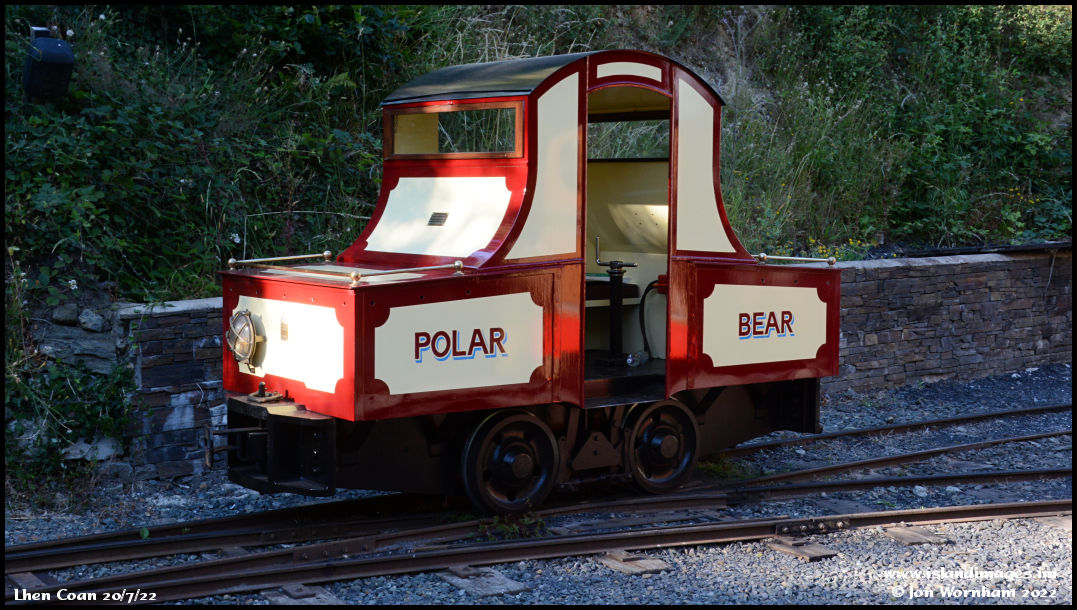 Battery electric loco 'Popar Bear' stands in the evening sunshine outside the loco shed at Lhen Coan on the Groudle Glen Railway