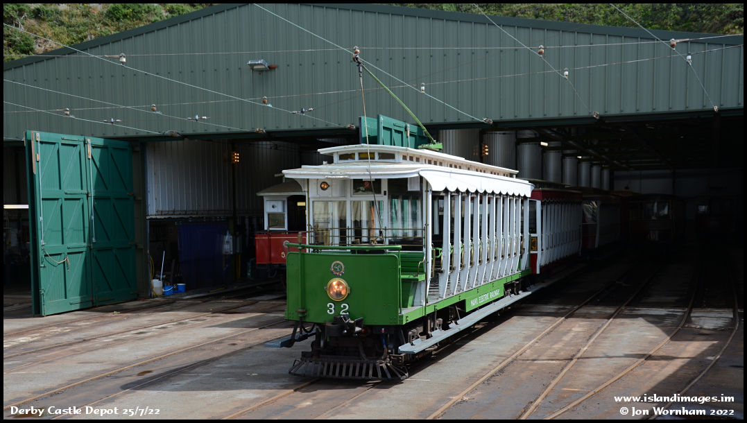 1906 vintage open crossbench Car No 32 stands outside the depot at Derby Castle. Together with No 33, these were the last motorised trams to be delivered new to the railway.