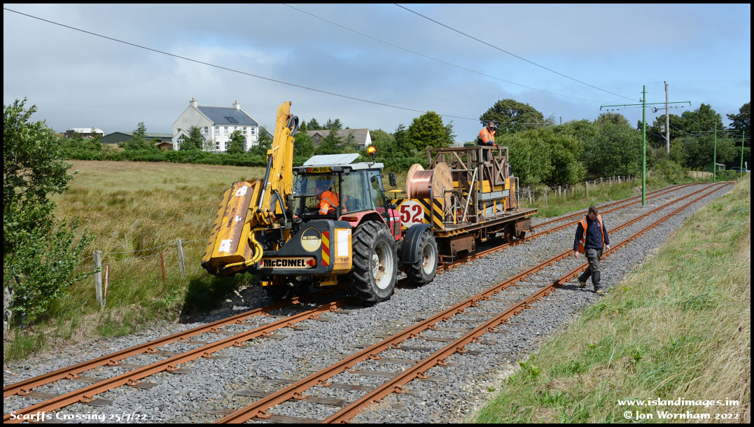 Heading south again, I caught up with the wire team near Scarffe's Crossing, using tower wagon No 52 and a rather unusual 'locomotive'. No 52 was one of the original 1893 trailers but lost its seat and roof in the 1940s.