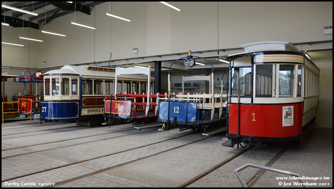 The line of trams from the other direction.  Car No 1 is in fact not the first to carry that number, the original was scrapped by 1901 and this 'newcomer' dates from 1913. No 12 is the oldest still in service, being delivered to the tramway in 1888.