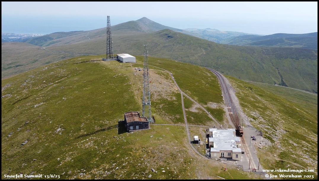 Looking across the summit station and cafe area with Car No 4 still in the station. North Barrule in the distance but it's too hazy today to see across tothe Cunbrian Mountains in England.