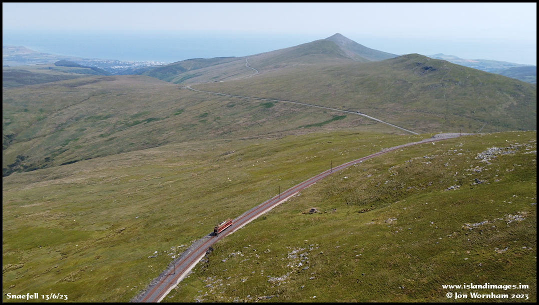 Car No 4 has now started the trip back to Laxey and is circling around the summit with North Barrule and Ramsey visible.