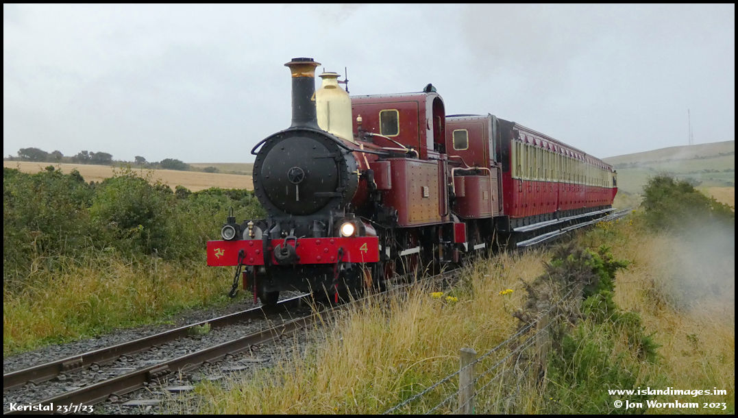 'Loch' and 'Fenella' about to pass by, heading towards Port Soderick. One advantage of the rain is that, although the train is full of enthusiasts, there are no heads poking out of windows!