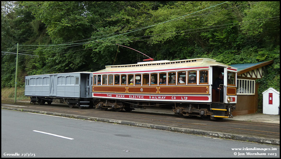 A well loaded Car No 6 passing Groudle Station with freight trailer No 26. Note the post box just ahaed of the car, the MER at one time picked up the mail from these lineside post boxes.