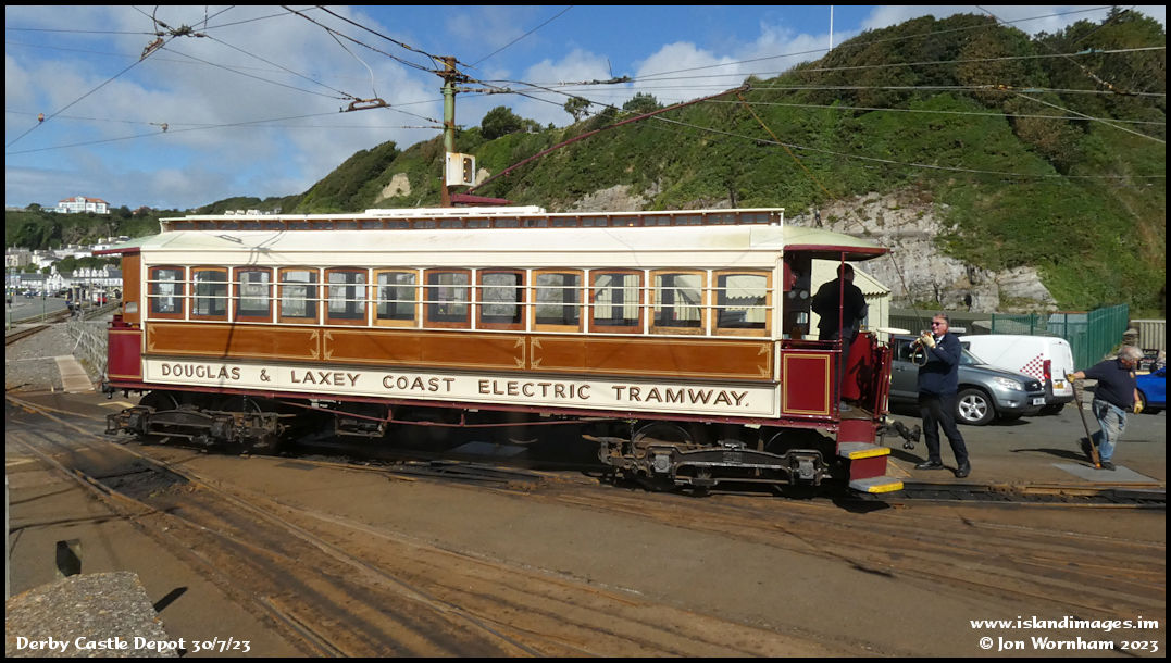 Car No 2 in the depot area about to reverse back and pick up a trailer. The overhead cables are necessarily complicated here and need some careful working of the trolley pole by the conductor.