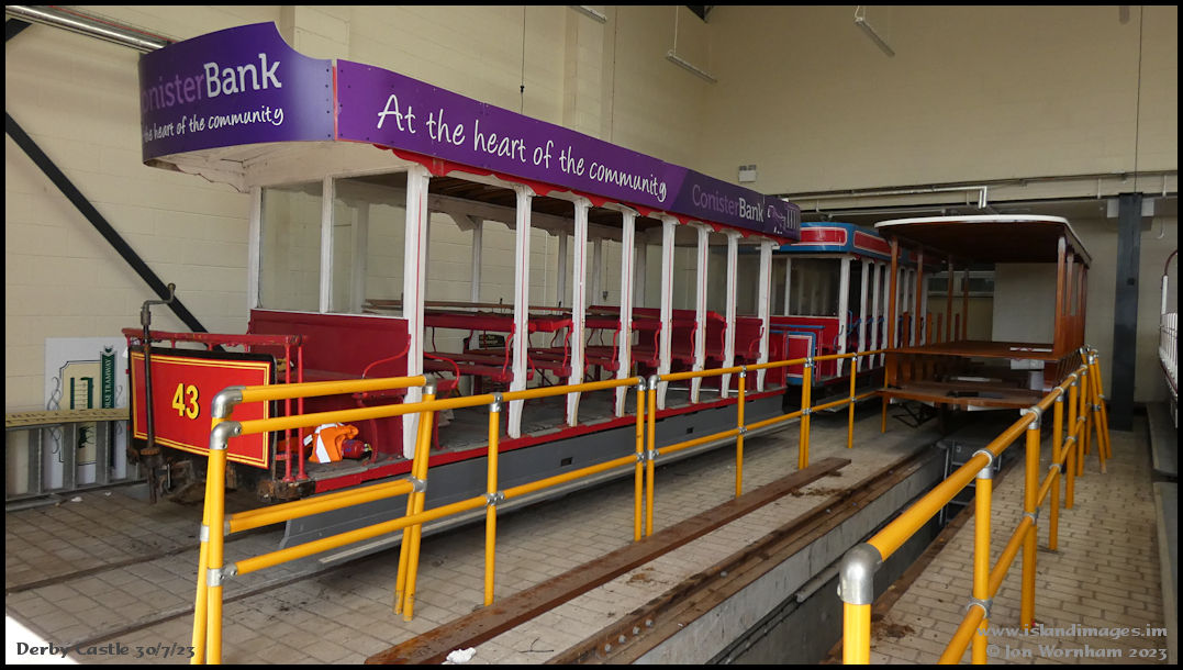 Tram No 43 of 1907 with 'Royal Tram' No 44 of the same year behind. An unidentified car is in process of restoration over the pit.