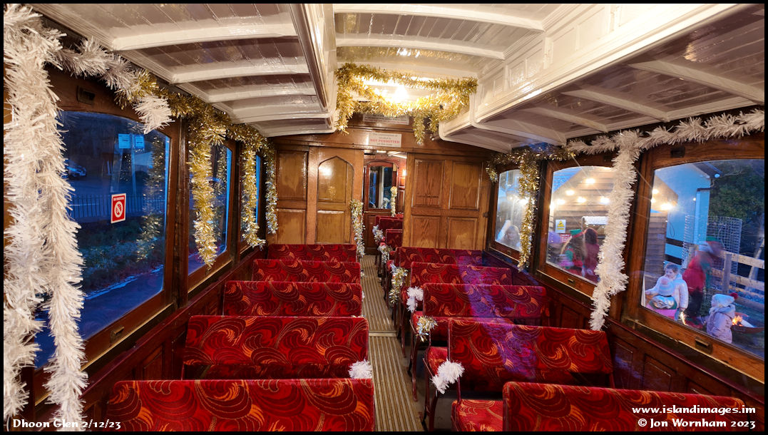 The decorated interior of Car No 20. There's quite a pronounced superelevation to the tracks at Dhoon Glen, so yes, the car is leaning over a bit!
