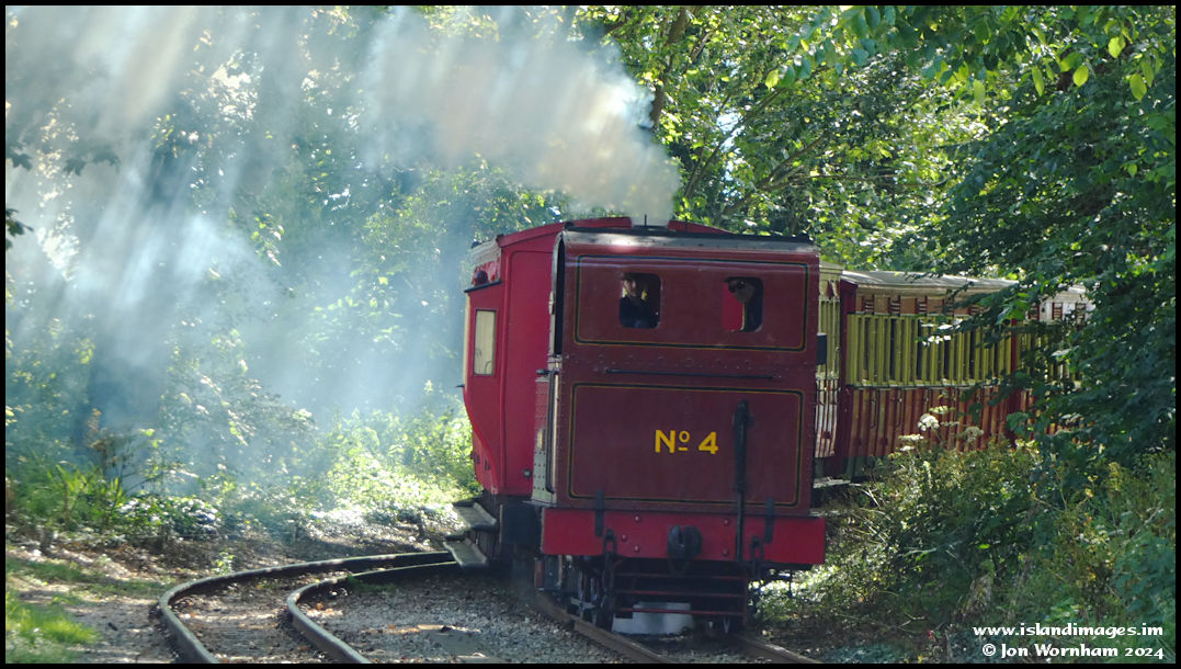 Shafts of sunlight penetrate the smoke as No 4 'Loch' arrives at Castletown with a train from Port Erin.