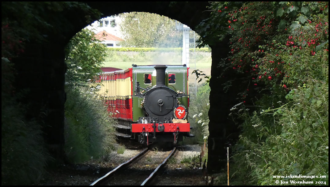 No 11 'Maitland' is nicely framed by the bridge as she approaches Castletown with a train from Douglas, carrying a 'Manx National Week' headboard.