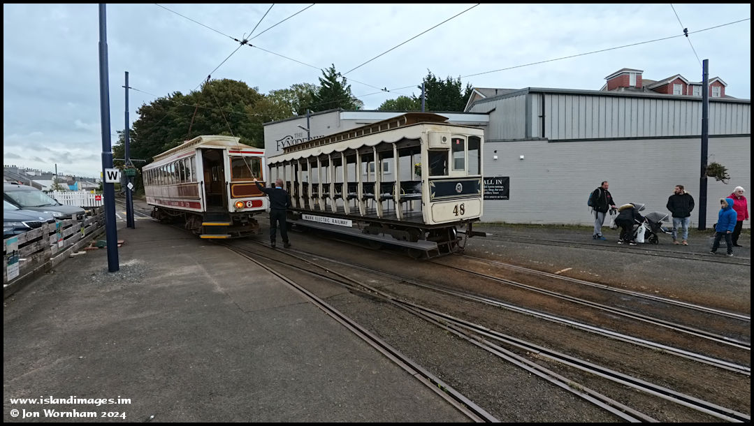 Gravity is used to move the trailer back into the station, with the conductor controlling speed with the handbrake. The driver is changing round the trolley pole again.