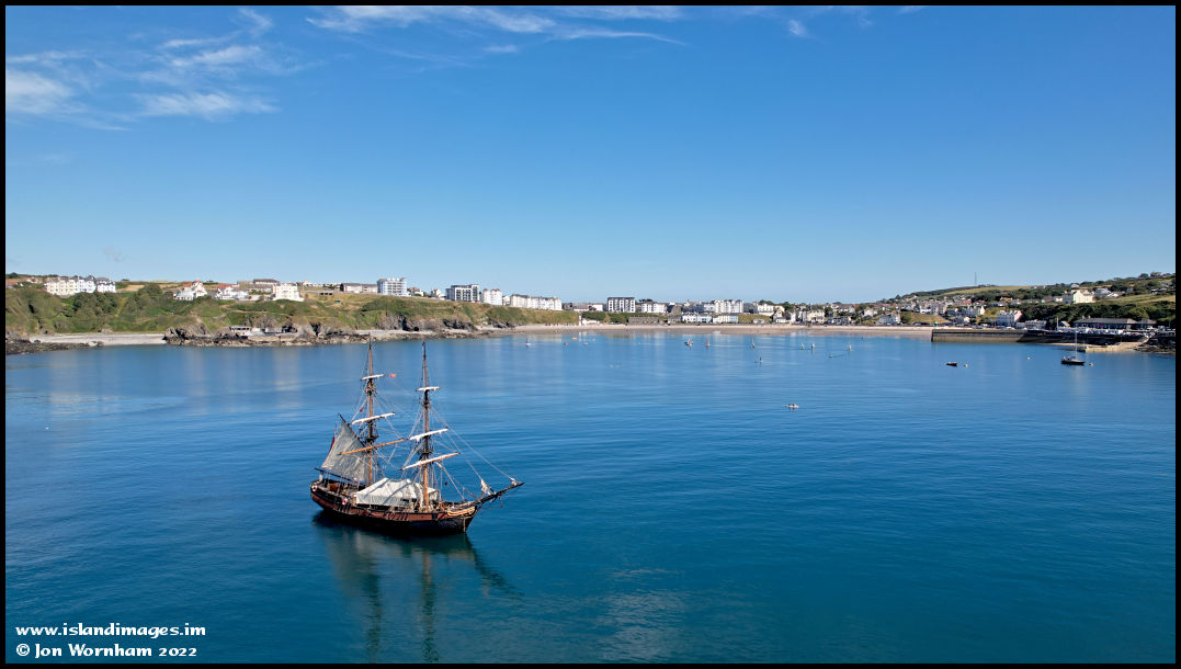 Dropping lower over the sea and moving around the ship to place Port Erin behind.
