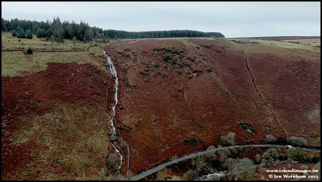 My first waterfall in this area, the tall skinny one that drops over 400 ft down the hillside from the area of Killabrega tholtan before joining the Sulby River. The tholtan can be seen over to the top right.