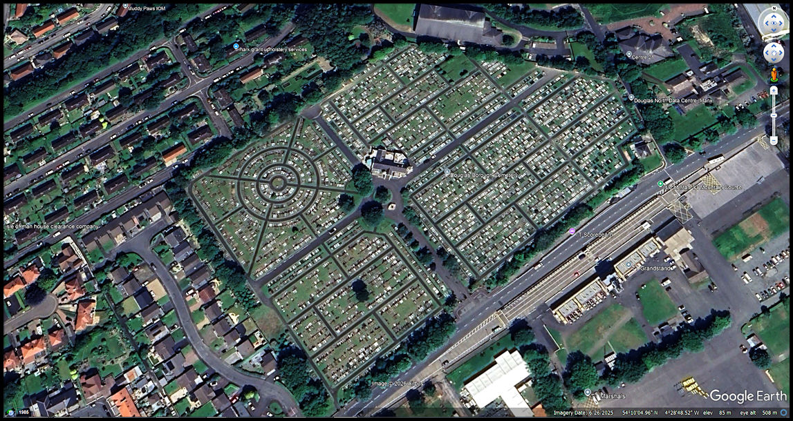 A Google Earth view of the Douglas Borough Cemetery takin in 2025. The western section is totally arranged around the weather station!